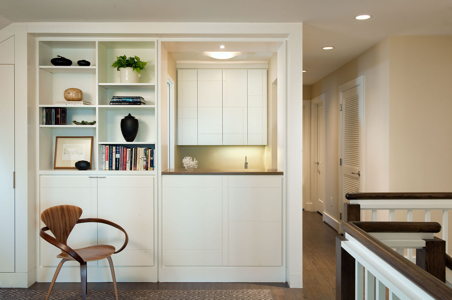 The existing first and second floor plans were completely open spaces, with no architectural distinction for the types of living spaces and privacy required for the new Owners. The design concept was to differentiate the various areas of the house, provide functional storage, and optimize views and natural light throughout with a series of stained wood cabinet “frames” inset in white painted columns. Careful attention was given all aspects of the interior to reinforce the design concept: new trim and casing, a new stair rail and balustrade and new single panel translucent resin doors. Warm and reflective material and color palettes of stained maple, walnut, jersalem limestone, and glass mosaic tile were selected to compliment the Owners furnishings.