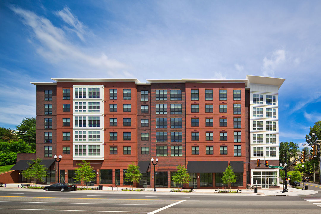Developed by AHC, Inc., this mixed-use redevelopment is located in the Columbia Pike Special Revitalization District in Arlington, Virginia, and received the first Administrative Approval under the Form-Based Code process. The Shell represents a creative land assemblage by AHC. Harvey Hall, an adjoining existing affordable apartment community with unused density, was combined with an adjacent 1950’s era gas station to establish a very prominent corner parcel. The Shell contributes 83 affordable apartments above ground floor retail to the revitalization of Columbia Pike. The ground floor street level includes the main campus of a Montessori school, also designed by Cunningham | Quill. This project continues the transformation of an aging car-oriented environment into a vibrant and walkable urban community.